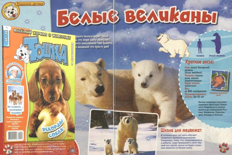 Прочитав статью из журнала «Тошка и компания» вы узнаете о том, что белый медведь – самый крупный хищник на Земле! И этот тысячекилограммовый гигант может бегать со скоростью скаковой лошади (до 45 км/час), плавать (со скоростью 6,5 км/час) и нырять в ледяной воде!