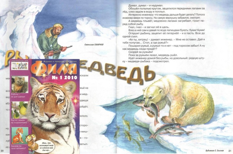 Сахарнов, Святослав. Рыба и медведь : рассказ / Святослав Сахарнов ; худож. Е. Ельская // Филя : журнал о природе для детей. – 2010. - № 1. – С. 20-21.