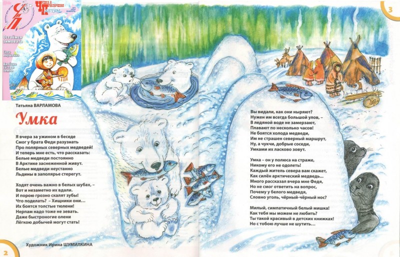 Варламова, Татьяна. Умка : стихотворение / Татьяна Варламова ; худож. Ирина Шумилкина // Чудеса и приключения детям : журнал для детей среднего школьного возраста. – 2019. – № 1. – С. 2-3.