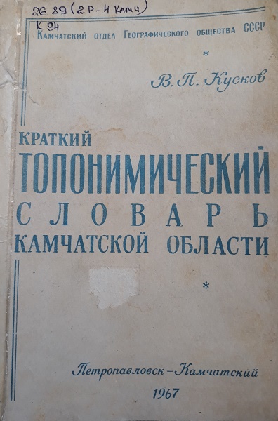Настоящей библиографической редкостью в наши дни стал «Краткий топонимический словарь Камчатской области», который представляет собой итог пятилетних исследований действительного члена Географического общества СССР В. П. Кускова. Автором детально изучено большое количество архивных, картографических и литературных материалов, содержащих сведения по топонимике Камчатской области. В результате собрана наиболее полная сводка, содержащая объяснение около 750 географических названий Камчатки, из которых значительная часть публикуется впервые".