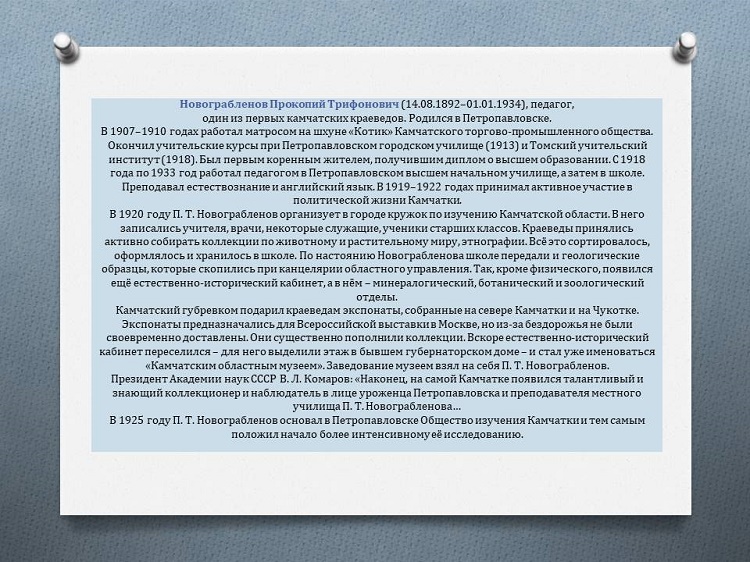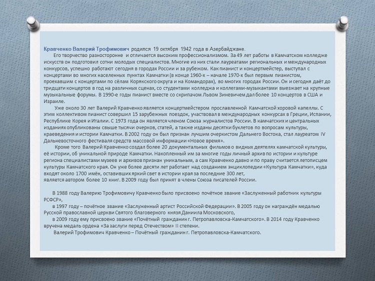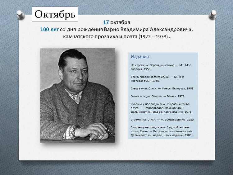 Продолжая знакомство с памятными датами 2022 года стоит отметить, что многие из них касаются людей, чьи биографии недостаточно широко отражены в книжных изданиях. Тем не менее, информация о них публиковалась в различных средствах массовой информации в течение прошлых десятилетий и зафиксирована в краеведческой систематической картотеке статей, которую библиотека №5 ведёт с 1980 года. Специалисты библиотеки советуют всем читателям, интересующимся историей Камчатки, не упускать этот способ нахождения необходимой информации.