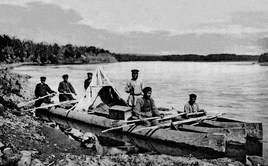 Исследователь Владимир Ильич Иохельсон с супругой, собакой и участниками экспедиции сплавляется по реке Коркодон (ныне Среднеканский район) по пути из Гижиги в Верхнеколымск на традиционном северном плоту. 1901 г.