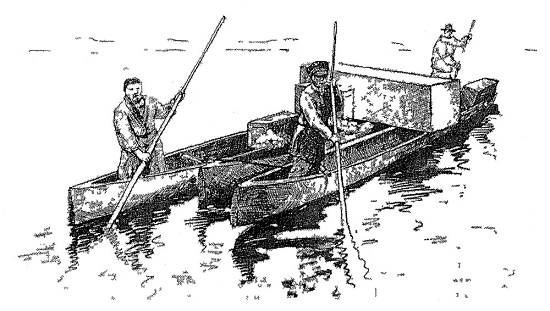 Строенные баты-катамаран для перевозки грузов, р. Ковран, 1911 г. (по В. И. Иохельсону)