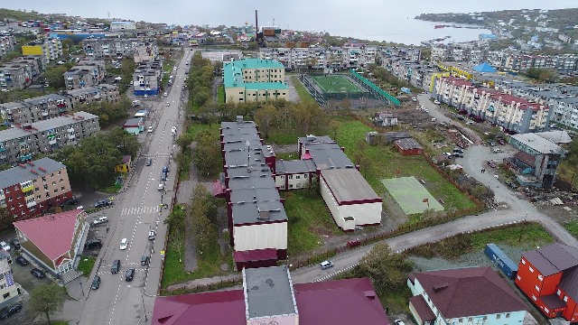 Район школы. Под зеленой крышей - школа №43, первая 7-я. Рядом сегодняшняя седьмая. В 1963 году в новом районе города Петропавловска-Камчатского открылась школа номер 7. Район рос огромными темпами и уже в 1966 году рядом была построена школа в два раза больше, в которую и перевели седьмую, а оставшаяся получил номер 43. Сейчас стадион у 43 гораздо лучше, чем у седьмой....