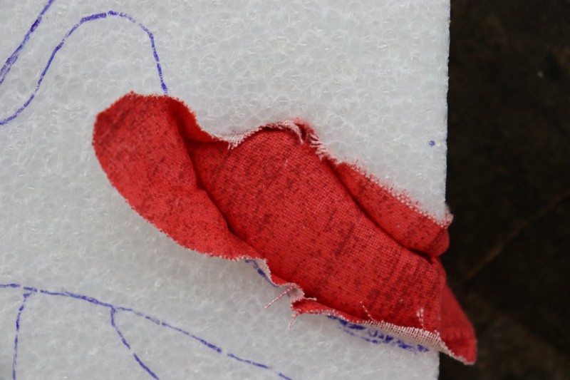 4. Возьмите один лоскуток, приложите его к нужному участку на пенопласте и заправляйте края в вырезанный контур. Проделайте эту операцию со всеми остальными лоскутками.