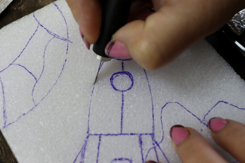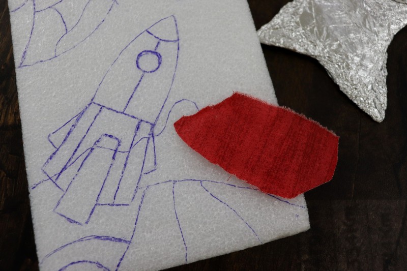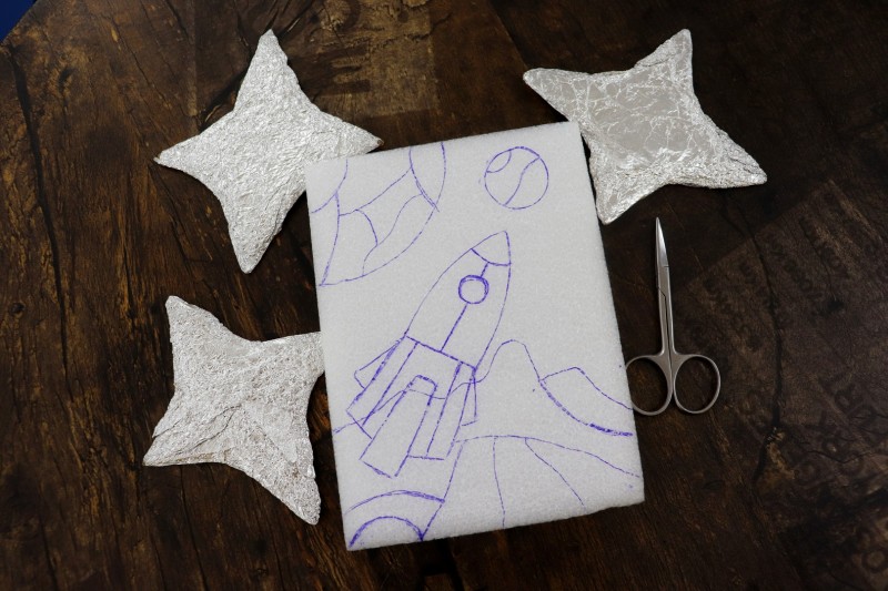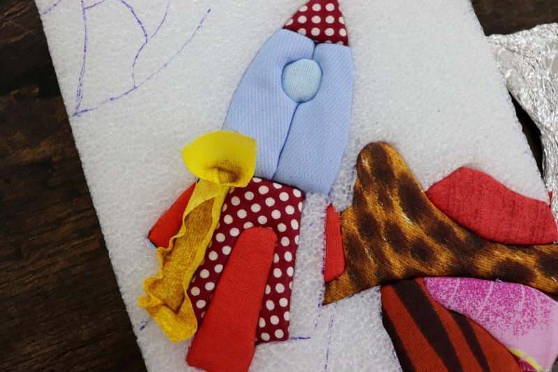 1. Определяемся с рисунком. Принимаем во внимание тот факт, что чем мельче детали, тем больше потребуется усилий, времени и терпения. Можно разделить рисунок на отдельные элементы, чтобы легче было перенести его на пенопластовую заготовку. Каждая фигура состоит из нескольких сегментов, которые будут заполняться тканью. Поделить ракету и планеты можно на части различной формы.