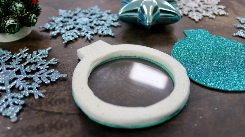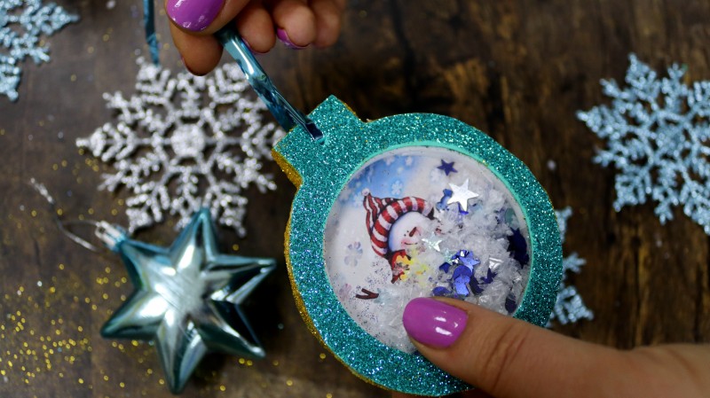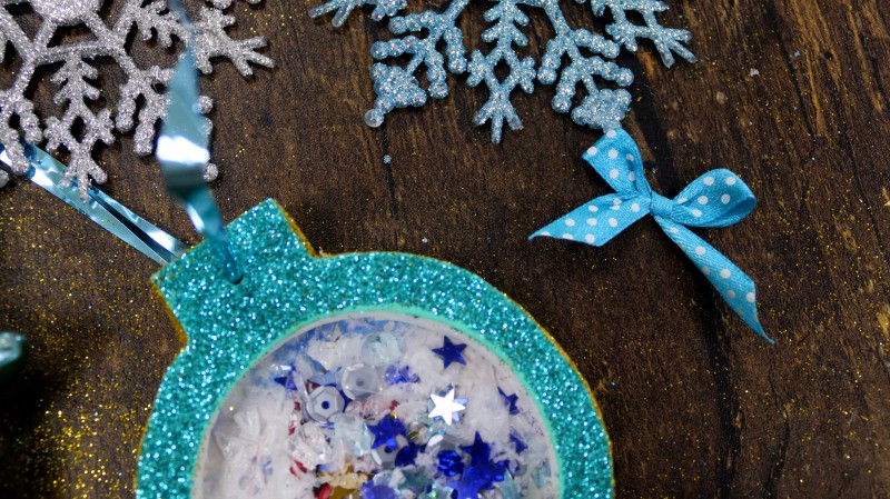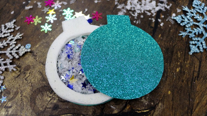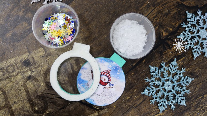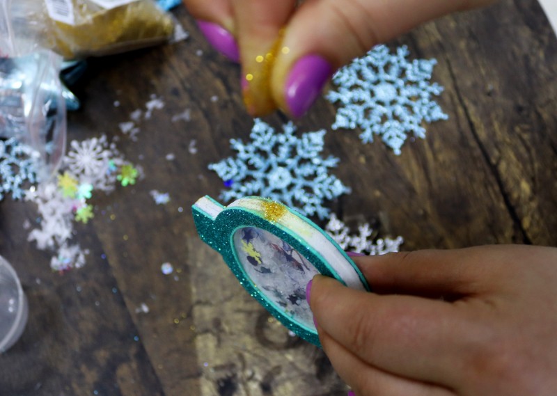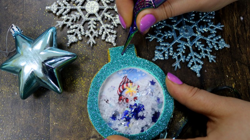 10. Теперь приступаем к самому интересному и творческому процессу. Заполняем полученное объемное "окошко" мелкими яркими детальками и искусственным снегом, которые будут перемещаться внутри при движении.