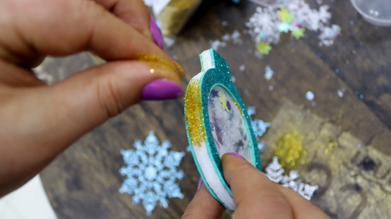 Пока клей не высох, посыпаем края игрушки блеском.