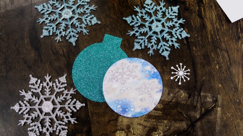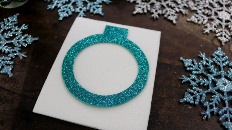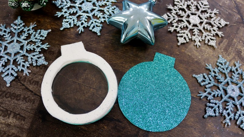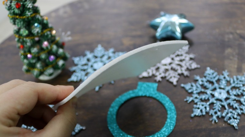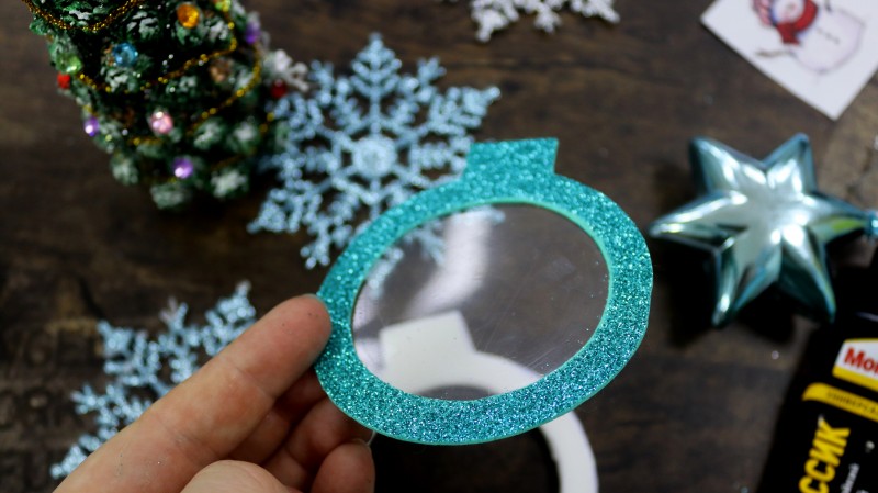 8. Приклеиваем подготовленный новогодний фон к изнаночной стороне заготовки из блестящего фоамирана без отверстия.