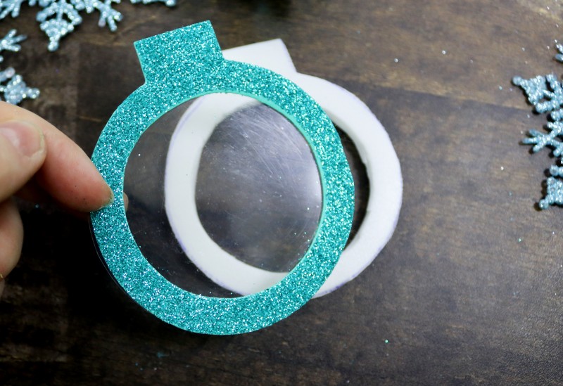 С изнаночной стороны заготовки с отверстием из блестящего фоамирана приклеиваем пластиковую заготовку.