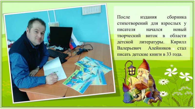 Продолжаем цикл историй о добром друге нашего Информационно-библиотечного центра для детей и юношества писателе Кириле Алейникове. В этот раз мы вам расскажем о новом творческом повороте в его судьбе. Кирилл Валерьевич Алейников стал писать детские книги в 33 года.