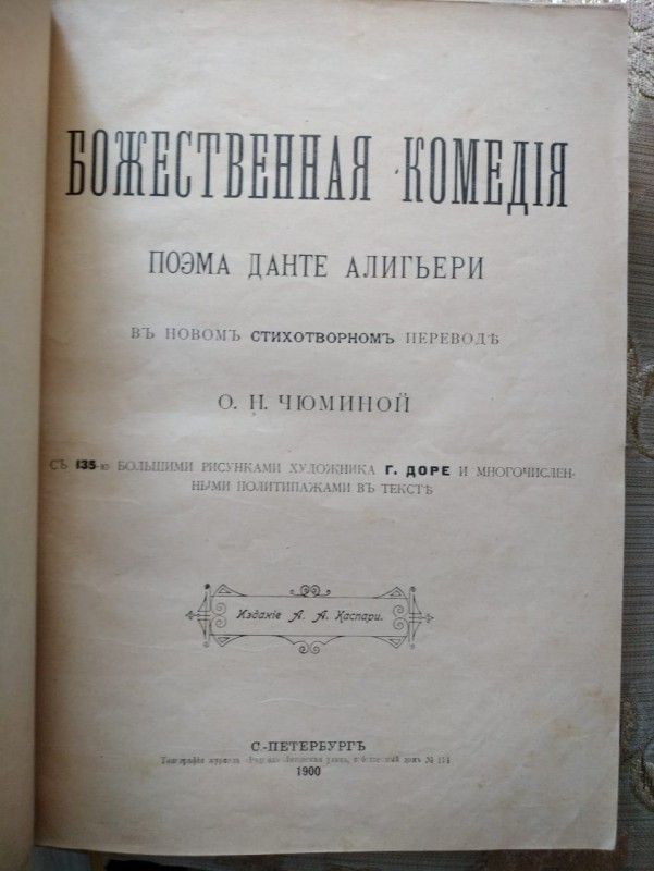 Приобретя первый том «Божественной комедии» Данте Алигьери, писатель озадачился поиском продолжения книги. И во время поисков нашёл раритетное издание А.А. Каспари типографии «Родины» 1900 года выпуска. Которые тоже приобрёл и переплёл, объединив в одну книгу.