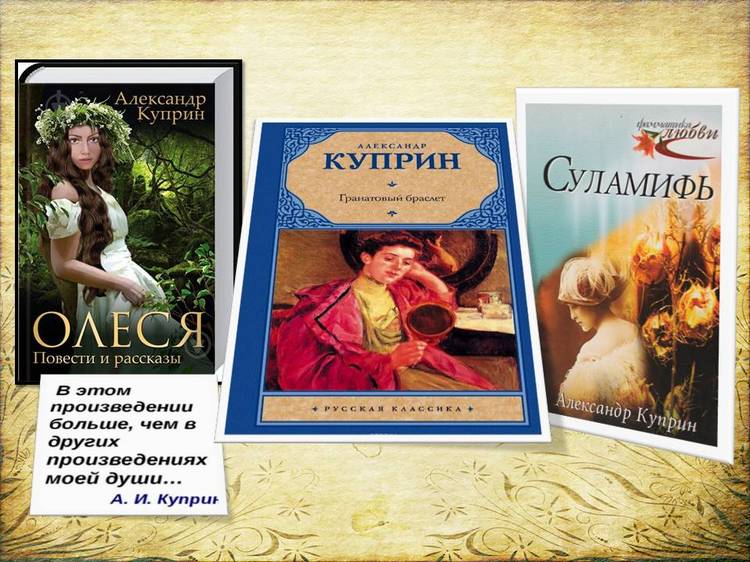 Писатель любит жизнь во всех её проявлениях, он восхищен способностью человека любить. Это неземное чувство автор описал в своих произведениях «Олеся», «Гранатовый браслет», «Суламифь».