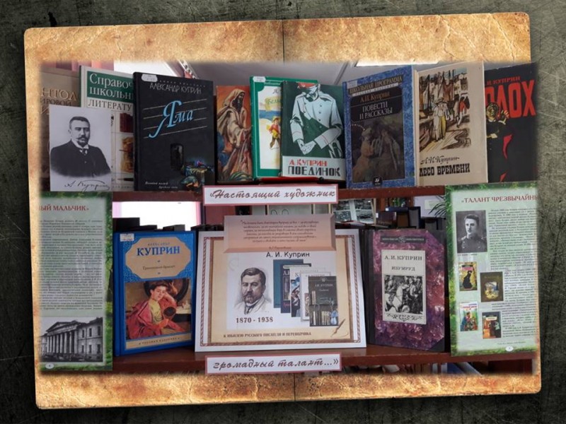 В библиотеке № 5 традиционно оформляются книжные выставки из цикла «Быть русским писателем». В сентябре исполняется 150 лет со дня рождения знаменитому писателю-реалисту Александру Ивановичу Куприну. Этому юбилею подготовлена тематическая выставка цикла «Настоящий художник, громадный талант…».