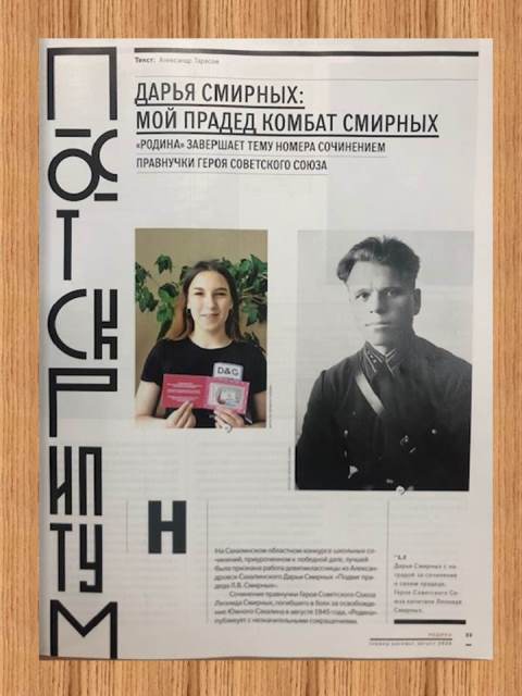 «Родина» завершает тему номера сочинением правнучки Героя Советского Союза Леонида Смирных, погибшего в августе 1945 года в боях за освобождение Южного Сахалина.