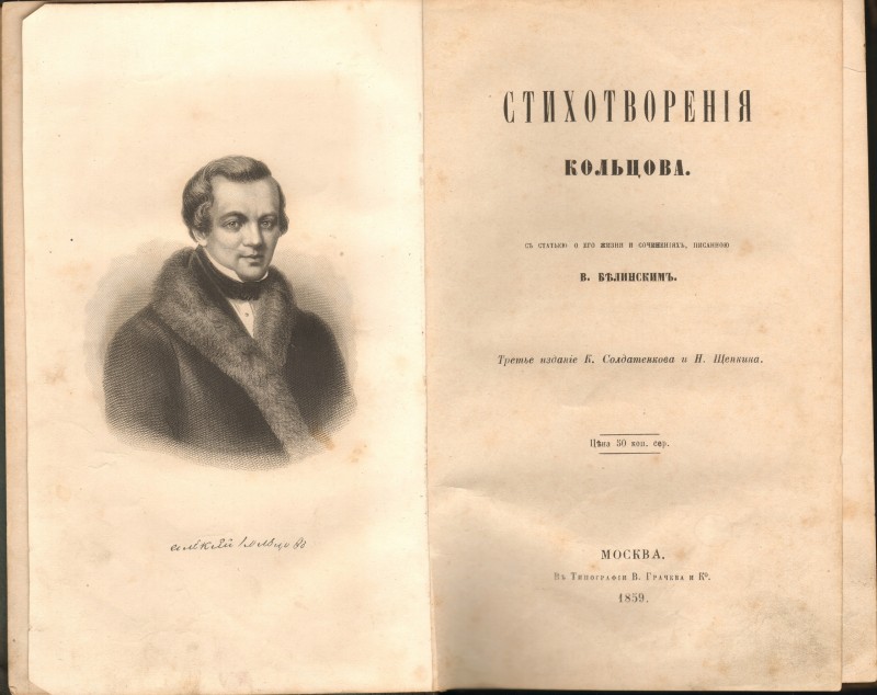 Первые публикации молодого поэта были анонимными, и только в 1831 году Кольцов под своим именем опубликовал стихи в «Литературной газете».