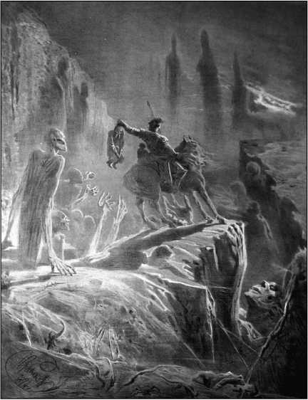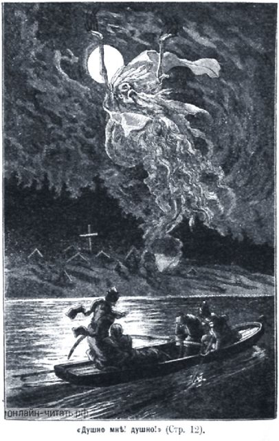 «Крест на могиле зашатался, и тихо поднялся из нее высохший мертвец. Борода до пояса, на пальцах когти длинные, еще длиннее самих пальцев. Тихо поднял он руки вверх. Лицо все задрожало у него и покривилось. Страшную муку, видно, терпел он. «Душно мне, душно!» - простонал он диким, нечеловечьим голосом. …Зашатался другой крест, и опять вышел мертвец, еще страшнее, еще выше прежнего; весь зарос, борода по колена, и еще длиннее костяные когти. Еще диче закричал он «Душно мне!» - и ушел под землю. Пошатнулся третий крест поднялся третий мертвец. Казалось, одни только кости поднялись высоко над землею. Борода по самые пяты; пальцы с длинными когтями вонзились в землю. Страшно протянул он руки верх, как будто хотел достать месяца, и закричал так, как будто хотел достать месяца, и закричал так,как будто кто-нибудь стал пилить его желтые кости…»