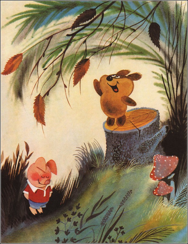 Что касается нашей страны, то самый узнаваемый образ нам подарил мультфильм-трилогия Фёдора Хитрука. Автором рисунков к нему был Эдуард Назаров. Нельзя здесь не вспомнить и о незабываемом голосе Евгения Леонова, которым Винни Пух рассказывал нам все свои сопелки, бурчалки и пыхтелки.