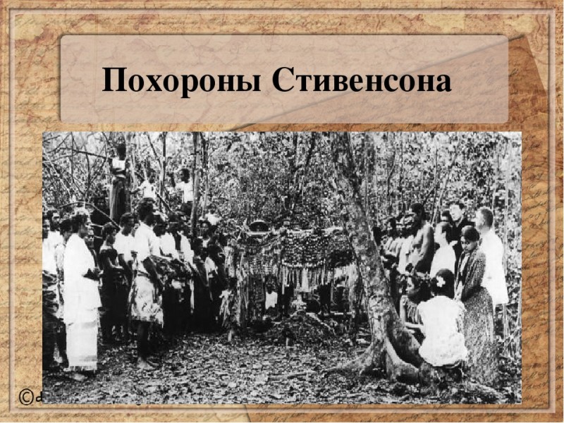 Еще при жизни Стивенсон стал легендой. Творцом этой легенды в значительной степени был он сам. На острова Океании, где жил писатель, отправлялись толпы паломников. В его доме подолгу гостили друзья. В торжественных случаях прислуга Стивенсона появлялась в раскрашенных королевскими цветами повязках на бедрах. Стивенсоны были на Самоа «первыми гражданами». Туземцы почитали Стивенсона, называя Тузиталою, то есть Певцом. Вожди острова расчистили до дома Стивенсона «дорогу любящих сердец», «дорогу благодарности». 13 ноября 1894 Стивенсону исполнилось 44 года, по этому случаю на острове состоялся праздник. А 3 декабря, занимаясь домашними делами, Стивенсон вдруг упал - кровоизлияние в мозг. Через два часа он умер.
