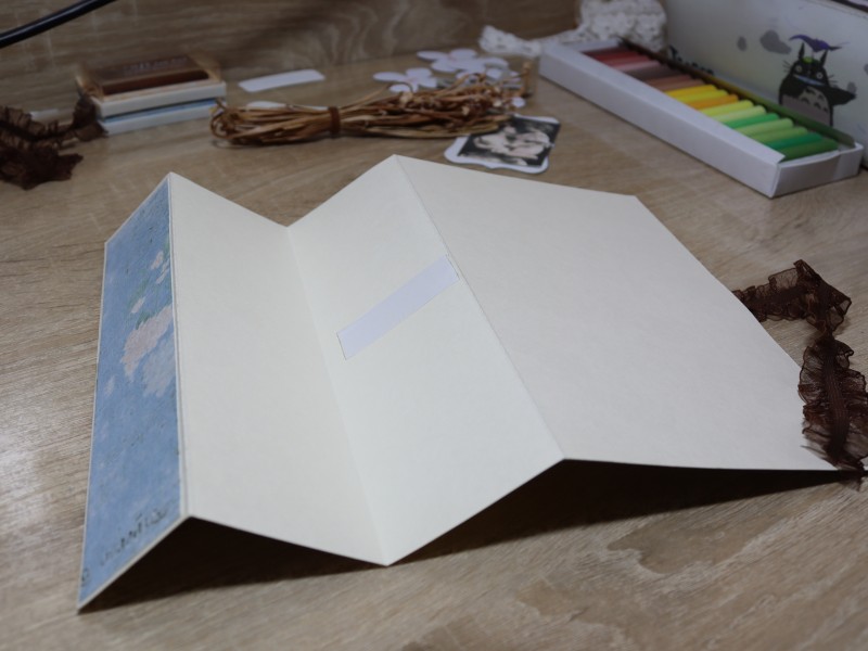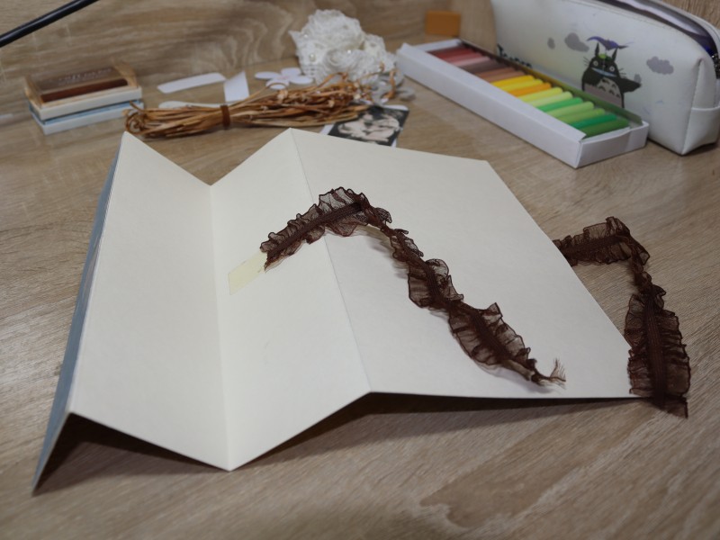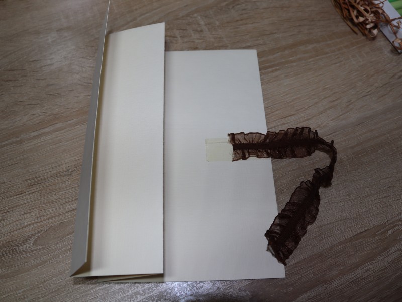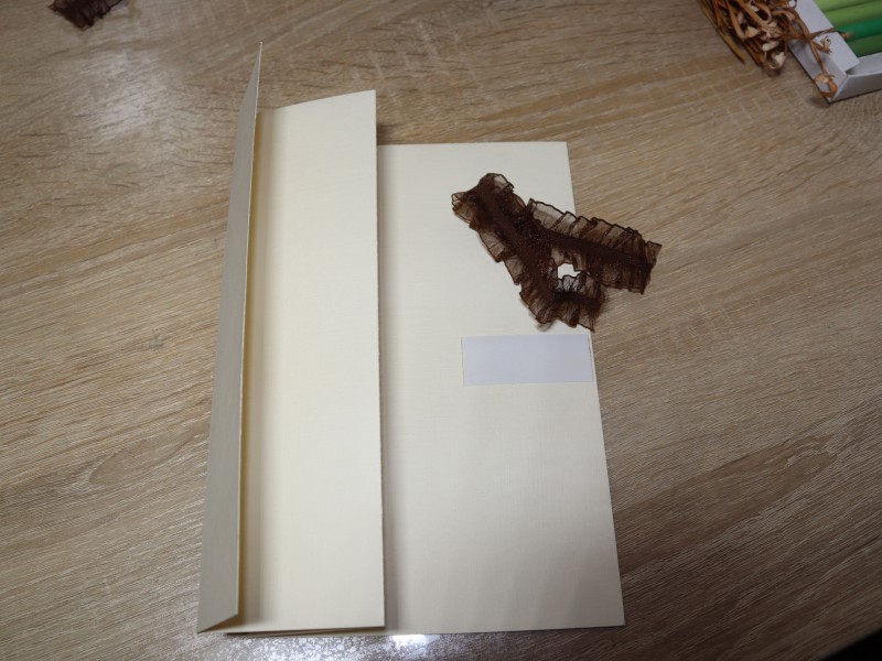 Перед тем как соединить детали необходимо приклеить завязки для нашей открытки. Для этого на широком прямоугольнике основы с правой стороны приклеиваем отрезок скотча. Крепим на него одну ленточку. Поверх этой ленточки наклеиваем цветной прямоугольник.