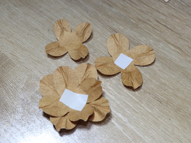 Соединяем 4 цветка между собой на двухсторонний скотч. И посередине крепим бусину.