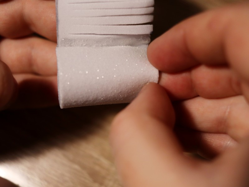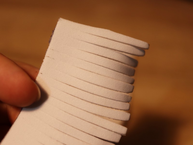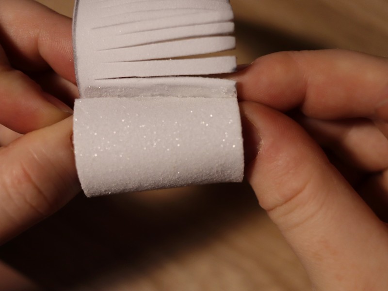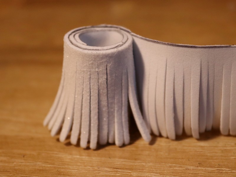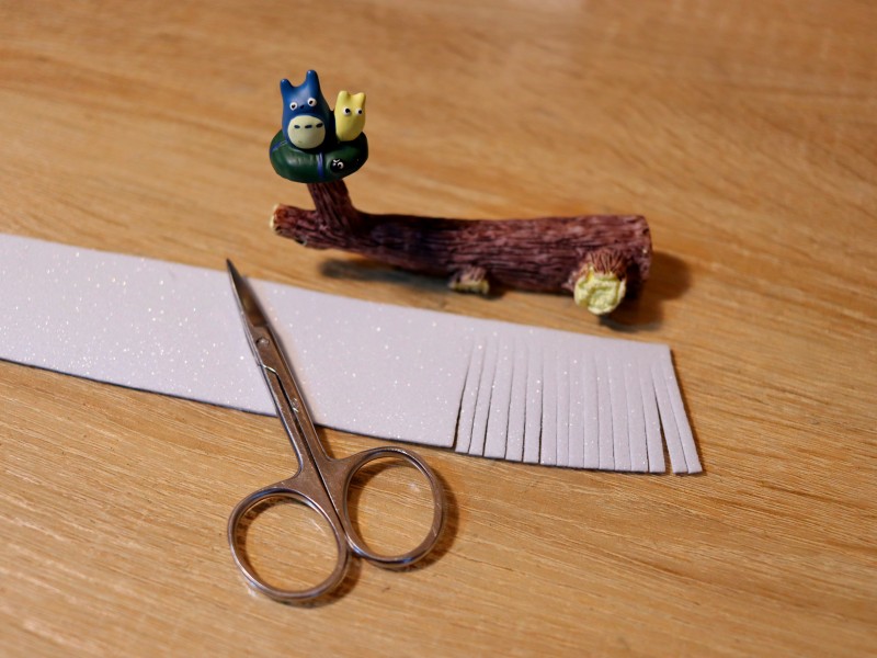 Берем полоску из белого фоамирама и делаем надрезы по всей ее длине примерно по 2-3 мм. Надрезы делаем не до конца, чтобы не отрезать лишнего. С одного края полоски оставляем 7 см. без надрезов. Это необходимо для склеивания нашей заготовки.