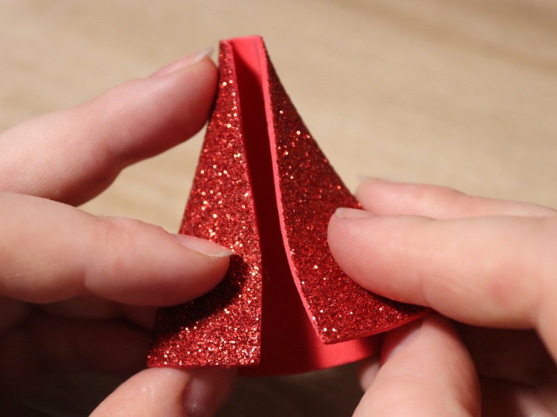 Отрезаем из белого фоамирама тонкую полоску размером 0,3х30 см. И обклеиваем наш колпак этой полоской по спирали, двигаясь от низа колпака к верхушке.