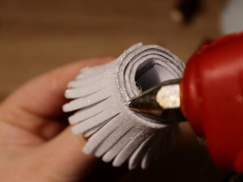 5. Наматываем полоску с надрезами на рулончик, нанося клей на верхнюю часть рулончика, и фиксируем.