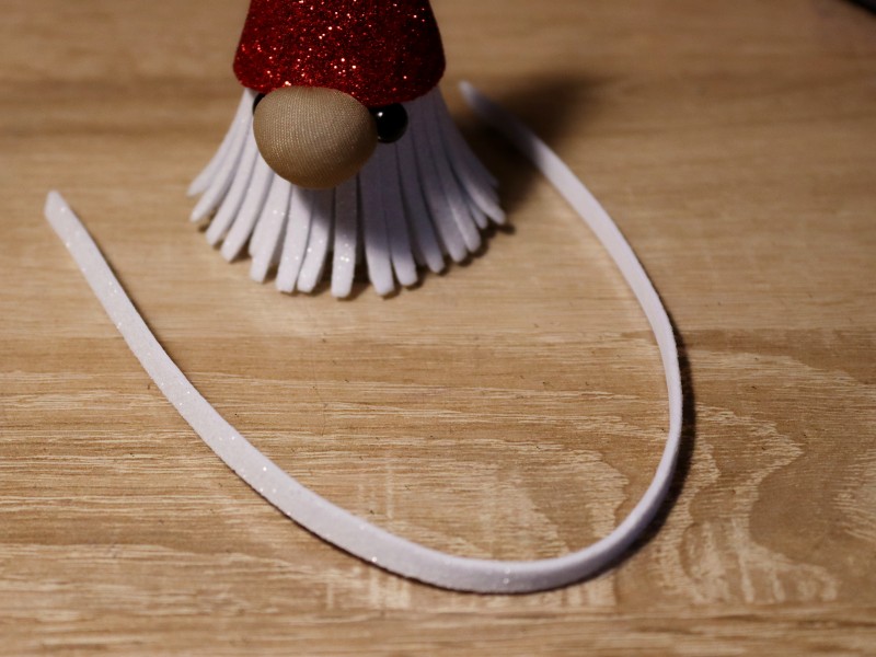 Одну заготовку вырезаем из белого фоамирама размером 4х30 см. Это будет борода у гнома. Вторую заготовку вырезаем из красного фоамирама размером 7х7 см. Это будет колпак для гнома.