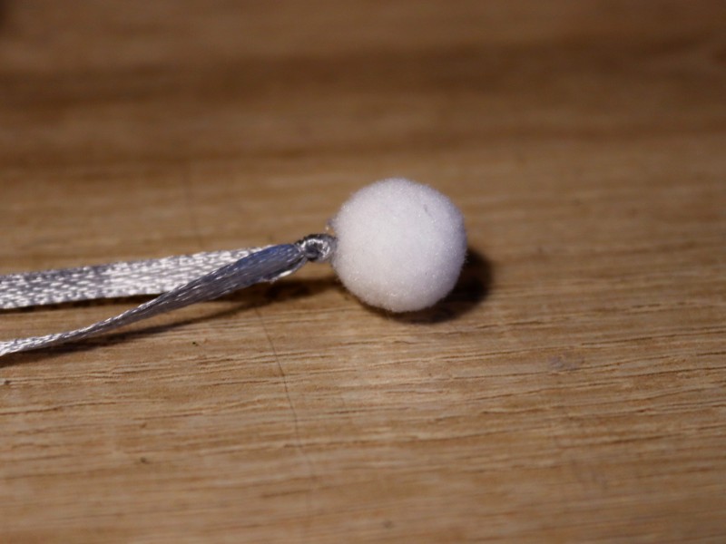 Берем ленточку или декоративную нитку, формируем петельку и завязываем на краешке узелок. Это будет петелька, за которую можно будет вешать нашу игрушку. Подрезаем ненужные края ножницами. Соединяем помпон и петельку между собой клеем. Там, где находится узелок, приклеиваем маленький помпон.