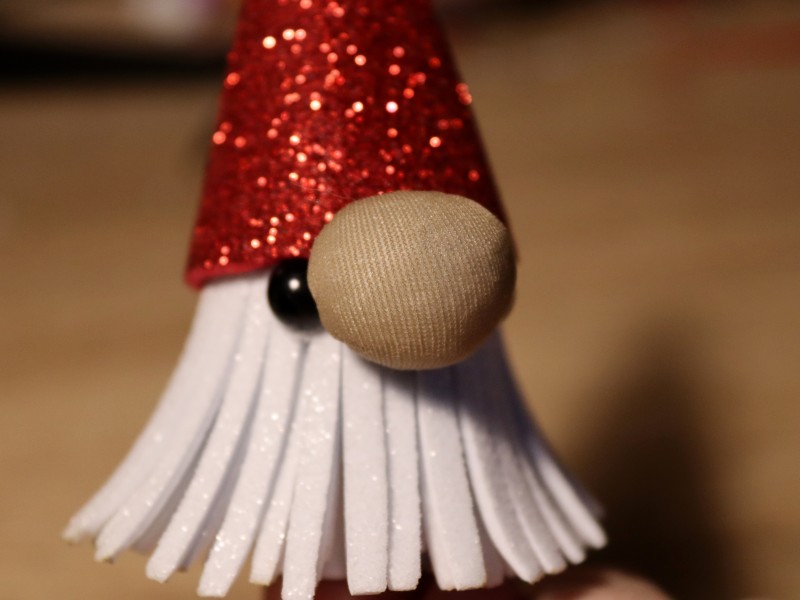 14. Остается только придать нашему новогоднему гному праздничный вид. Украшаем колпак декоративными элементами: снежинками, пайетками, звездочками. Фиксируем с помощью клея.