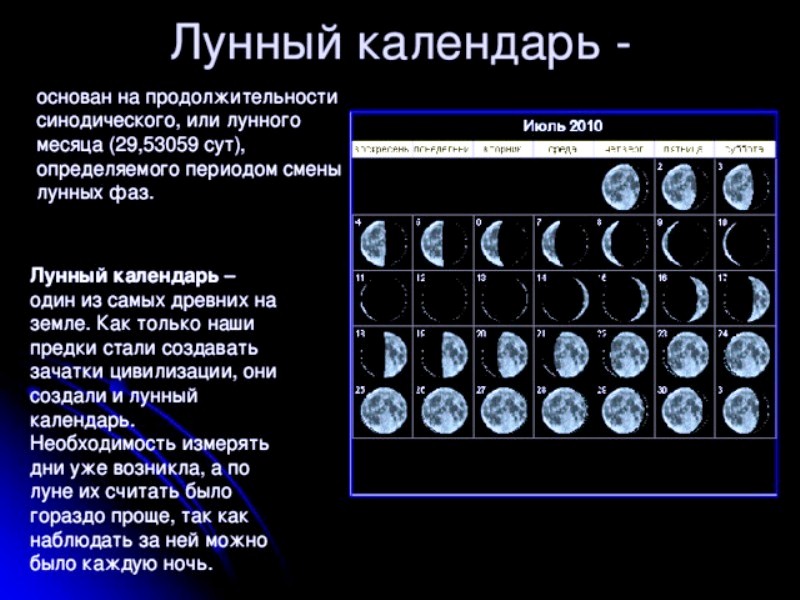 Лунный календарь зародился у древних пастушеских народов, которые вели кочевой образ жизни. Когда же люди перешли к оседлости и начали заниматься земледелием, появилась необходимость определять сроки посева и жатвы. Эти сроки были связаны со сменной времен года и видимым движением Солнца. Потребность предвидеть наступление зимы, весны, лета или осени привела к появлению первых солнечных календарей и более крупной, чем лунный месяц, единицы измерения времени – солнечного года.
