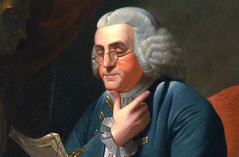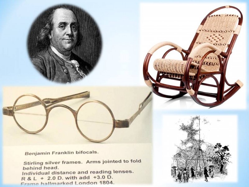 Ему приписывают целый ряд изобретений: кресло-качалку,бифокальные очки, молниеотвода. По словам историков, он ужасно страдал от плохого зрения. Будучи известным ученым и интеллектуалом, в 1784 году Бенджамин разработал те очки, которые позволили ему видеть как далеко, так и близко. Президент взял двое очков, разрезал их линзы пополам и вставил в оправу. Таким образом верхняя часть линзы была предназначена для близорукости и позволяла видеть предметы вдалеке, а нижняя — для дальнозоркости, чтобы читать и видеть вблизи. Правда, глаза от таких очков быстро уставали, а сами линзы иногда выпадали, но это была первая попытка создания бифокальных линз.