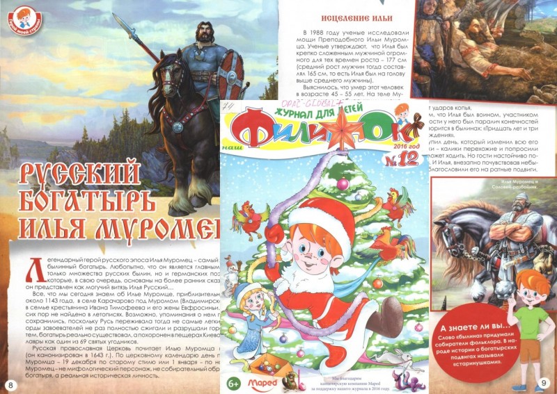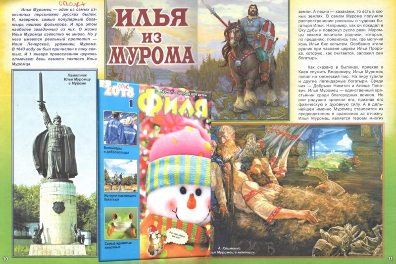 На страницах журнала «Филя» вы прочитаете о жизни и подвигах былинного богатыря. Илья Муромец - один из самых известных персонажей русских былин. И, наверное, самый популярный богатырь нашего фольклора. И при этом наиболее загадочный из них. О жизни Ильи Муромца известно не много. Но у него имелся реальный прототип - Илия Печерский, уроженец из Мурома. В 1643 году он был причислен к лику святых. И 1 января православная церковь отмечает день памяти святого Ильи Муромца.