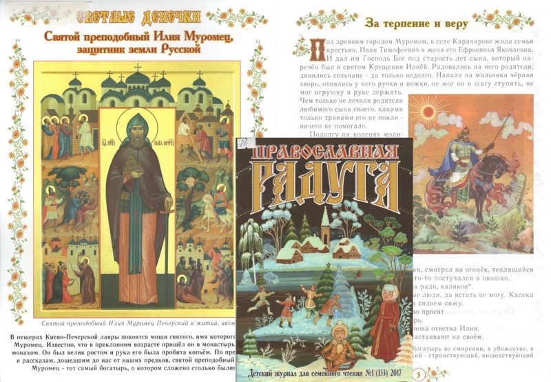 Пустышкина, Татьяна. Святой преподобный Илья Муромец, защитник земли русской / Татьяна Пустышкина // Православная Радуга : детский журнал для семейного чтения. - 2017. - №. 1 (133). - С. 2-7.