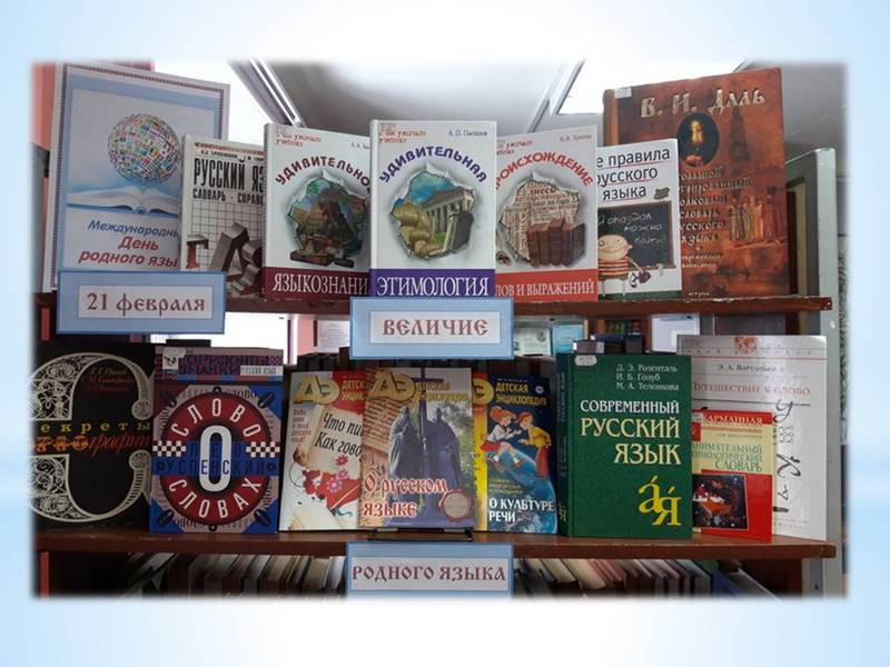 К этому дню библиотека № 5 оформила книжную выставку «Величие родного языка», на которой представлена справочная и отраслевая литература по языкознанию.