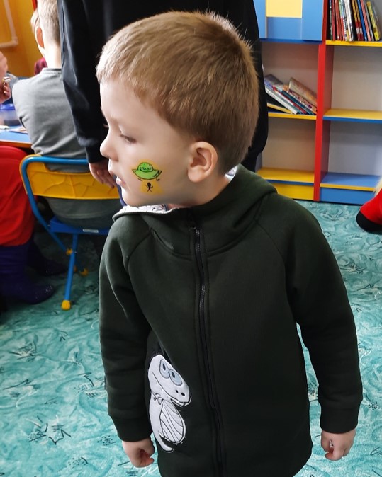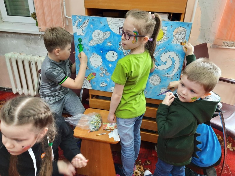 Продолжилась праздничная программа посещением студии аквагрима «Космогрим». Всем желающим было предложено выбрать себе понравившейся рисунок для нанесения космического узора на кожу.