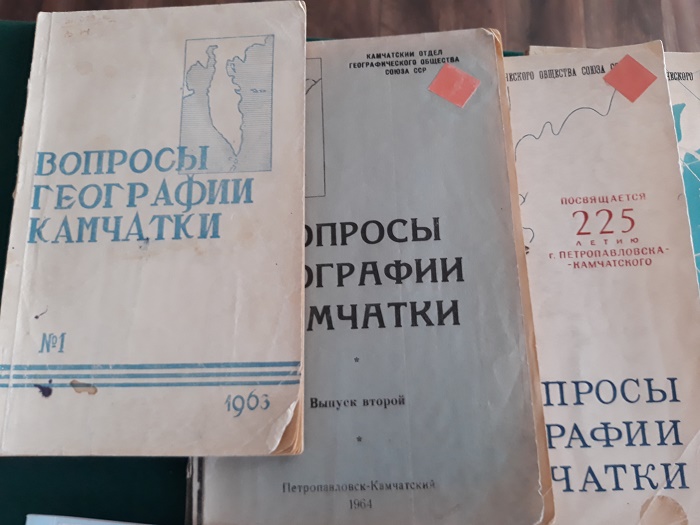 То были самые первые массовые издания о Камчатке местных авторов, членов Географического общества СССР. Они стоят того, чтобы их перечислить: "Слово на карте" (Воскобойников В. И. Петропавловск-Камчатский, 1962), "Краткий указатель литературы по истории и географии Камчатки" (Мартыненко В. П. Петропавловск-Камчатский, 1965), "Ледники Камчатки" (Виноградов В. И. Петропавловск-Камчатский, 1965), "Наблюдения камчатской природы" (Дьяконов П. Н. Петропавловск-Камчатский, 1966), "Краткий топонимический словарь Камчатской области" (Кусков В. П. Петропавловск-Камчатский, 1967), "Берег туманов и чудес" (Челноков Ф. Г. Петропавловск-Камчатский, 1967); сборники и брошюры: "По Камчатке" (Петропавловск-Камчатский, 1965), "По окрестностям Петропавловска-Камчатского за два дня" (Петропавловск-Камчатский, 1967), "Материалы по геологии и полезным ископаемым Корякского нагорья" (Петропавловск-Камчатский, 1969). Данные книги пользовались большой популярностью у жителей Камчатской области и сейчас являются библиографической редкостью.
