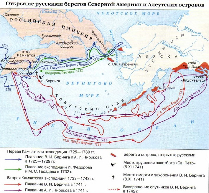 17 октября (по новому стилю) 1740 г. принято считать датой основания порта Св. апостолов Петра и Павла (его еще называли Санкт-Петропавловской гаванью, портом Санкт-Петропавловским, Петропавловским). Отсюда 4 июня 1741 г. пакетботы экспедиции вышли в свое историческое плавание. Пользуясь благоприятным юго-восточным ветром, корабли следовали курсом, предполагавшим выход к таинственной «Земле Гамы», мифическому острову, в существование которого верили тогда многие европейцы, он был обозначен на всех картах. Попытки Беринга найти якобы виденную в XVII в. португальцами землю привели к большой потере времени, что в дальнейшем имело трагические последствия для судьбы всей экспедиции. 20 июня пакетботы потеряли друг друга в тумане, находясь невдалеке от южного изгиба еще не открытого Алеутского архипелага. Отныне Берингу и Чирикову предстояло продолжать свой путь в одиночестве.