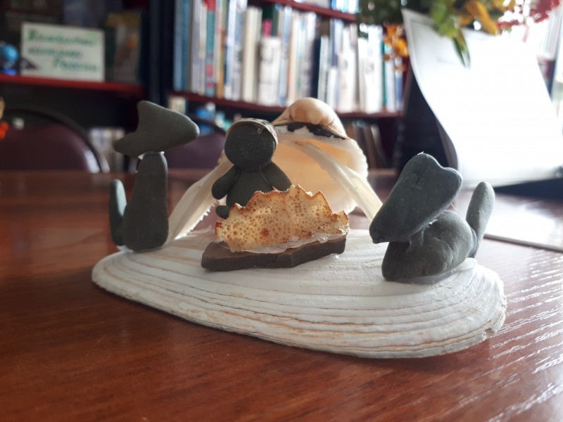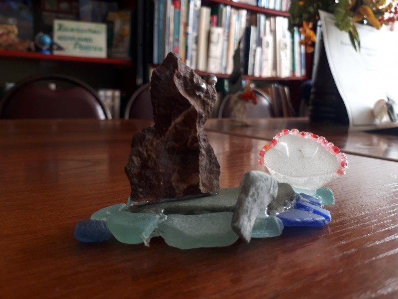 Все фигурки созданы из природных материалов: камчатский камень, ракушки, водоросли, костяные элементы. Как декор использован бисер и обточенное океаном стекло. Неимоверный полёт души, творчества, любовь к родному Камчатскому краю, к каждой травинке, дереву просматривается в каждой работе.