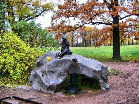 «Прекрасный царскосельский сад …» Это строчка из знаменитого стихотворения «Воспоминания в Царском селе», которое юный Александр Сергеевич Пушкин написал в четырнадцать лет специально для лицейского экзамена. Речь идёт об огромном Екатерининском парке, раскинувшемся вокруг дворца. Парк действительно был прекрасен. Трижды в день при любой погоде лицеистов сюда водили гулять. Огромные вековые деревья по краям дорожек росли, как в лесу. За деревьями прятался фонтан – бронзовая девушка с разбитым кувшином, из которого текла вода. Как приятно было зачерпнуть холодную струю в жаркий день.