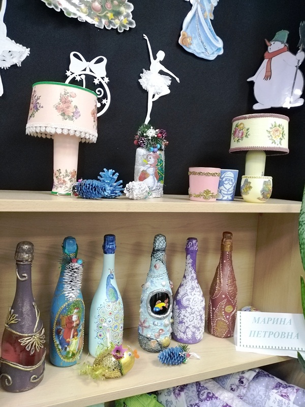 Декупаж предпочитает и Марина Петровна Ивлева. Мастерица использует и природный материал – это веточки, листочки, сосновые шишки, ракушки, ими она украшает новогодние игрушки, бутылочки, светильники, подсвечники, сувенирные лампы. Это отличный способ предать самой обычной вещи праздничный и оригинальный внешний вид.