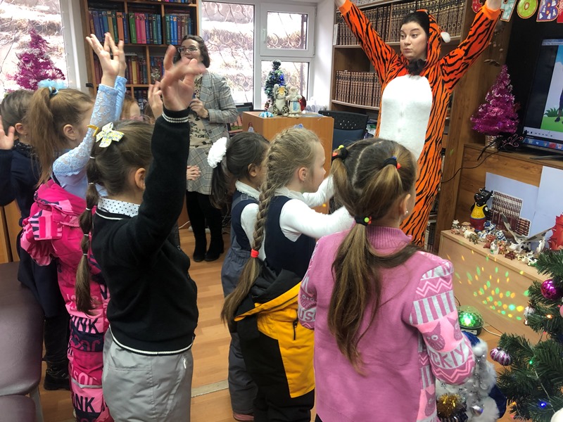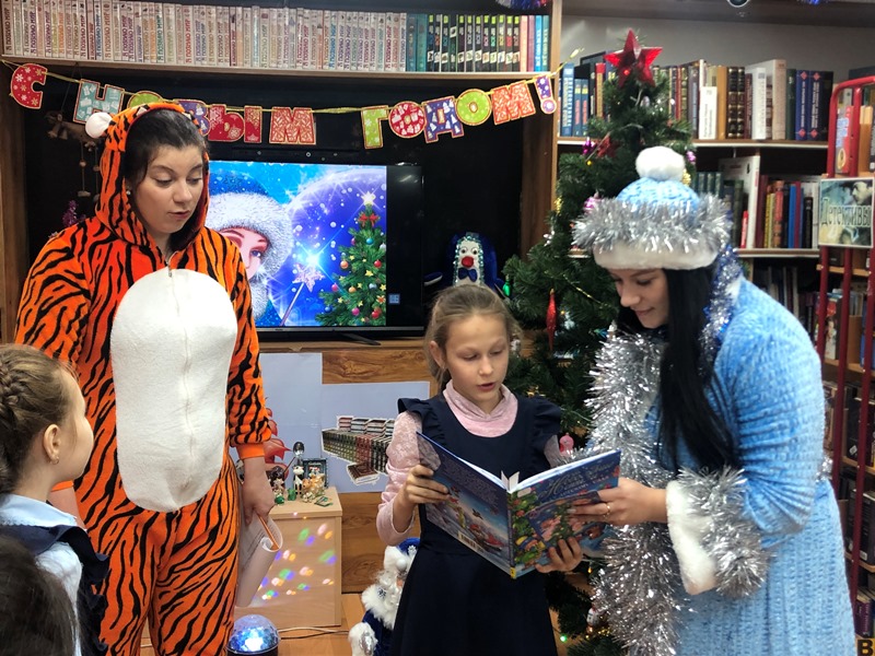 Радостное ожидание и предвкушение чудес царили в библиотеке с самого утра. Гостей встречали выставками самых красивых книг о зиме и полосатом символе наступающего 2022 года, мультимедийными презентациями о праздновании Нового года в разных странах, костюмированными играми и конкурсами, новогодними песнями и фотосессией у сияющей огнями елки.
