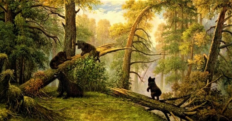 Весёлых медведей нарисовал на уже готовой картине Ивана Шишкина художник Константин Аполлонович Савицкий. И даже поставил свою подпись на картине рядом с автографом Шишкина. Как ему удалось уговорить Ивана Шишкина написать картину в соавторстве, неизвестно. Зато известно точно, что Павел Третьяков взял в руки тряпку со скипидаром и лично стёр подпись Савицкого. К слову сказать, Шишкин поделился с другом гонораром, но больше животных в своё художественное пространство не впускал.