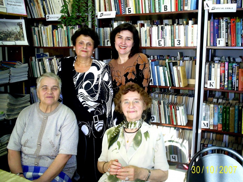 Коллектив библиотеки №5 в 2007 году: в нижнем ряду Р.И. Вшивкова и О.В. Тетрад, в верхнем ряду Л.Г. Лесных и И.В. Кисличенко