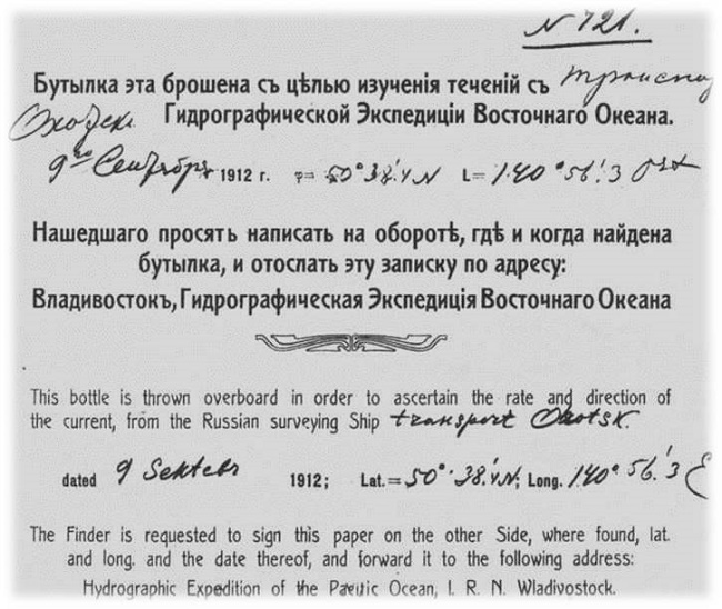 Через 78 лет бутылку с транспорта «Охотск» ГЭВО, брошенную в точке с координатами 50°38' с. ш. 140°56' в. д., нашла М. И. Ярычина в пляжной зоне острова Сахалин 13 августа 1988 г.