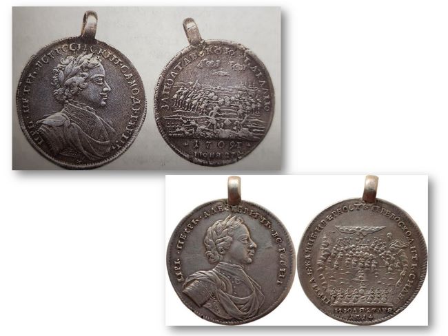 Петр Великий учреждал не только ордена, но и чеканил медали в честь славных побед. Первая офицерская медаль появилась в 1702 году, ею награждали за взятие шведской крепости Нотебург в истоке реки Невы. На аверсе медали был выбит профиль Петра, на реверсе – шведская крепость в дыму и плывущие к ней лодки с русскими солдатами. В дальнейшем подобные медали чеканились неоднократно. После победы под Полтавой в 1709 году Петр I наградил всех участников боя.