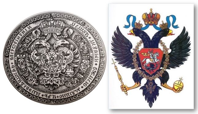 В петровскую эпоху государственный герб страны дополняется новыми символами. Изменилась его раскраска: орёл официально стал черным, а фон – желтым. Это были характерные имперские цвета. На правом крыле орла размещались щиты с гербами Киевским , Новгородским, Астраханским, на левом – Владимирским, Сибирским, Казанским.