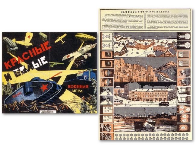 Советские настольные игры 1920 – 1930-х годов выражали настроения и мечты тех лет. В игре 1925 года «Перелет Москва – Китай» надо было обогнать соперников, долетев от Москвы до Пекина. А в игре «Электрификация» 1928 года – быстрее всех внедрить электрическую энергию в страну. В военных играх "красные" сражались с "белыми", велись воздушные, танковые и морские бои.