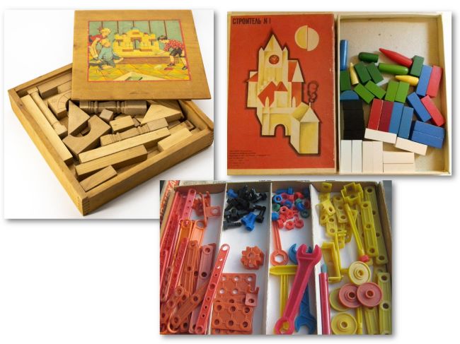 В советское время видов конструкторов было немного, но детскую фантазию это не ограничивало. У малышей были кубики и наборы бревнышек, брусочков, из которых можно было строить дома и башни. Впервые о роли кубиков для развития детей рассказал в ХVII веке английский философ Джон Локк. Он описал игру, которая вскоре стала чрезвычайно популярной – кубики с алфавитом, подчеркивая достоинства обучения детей с помощью игр. В прошлом такие конструкторы назывались «Архитектор» и «Строитель». В них входили панели для сбора многоэтажных домов, арки, цилиндры, конусы для башен, деревья. Из простых элементов можно было создать сложные конструкции.